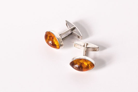Butoni barbatesti din argint cu chihlimbar sintetic, sec. XX